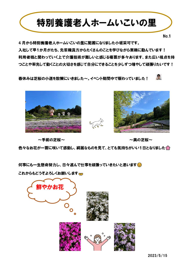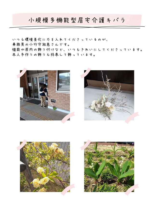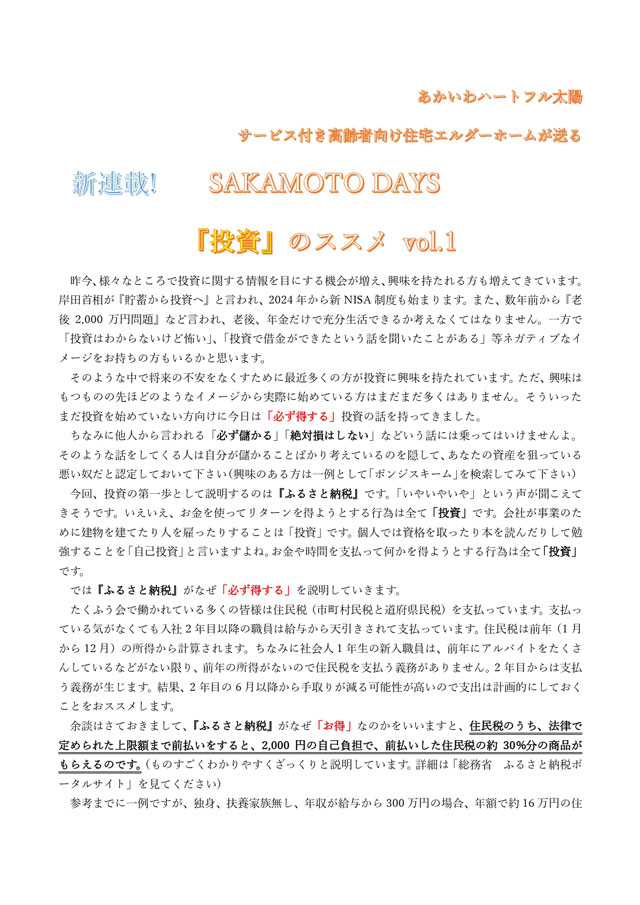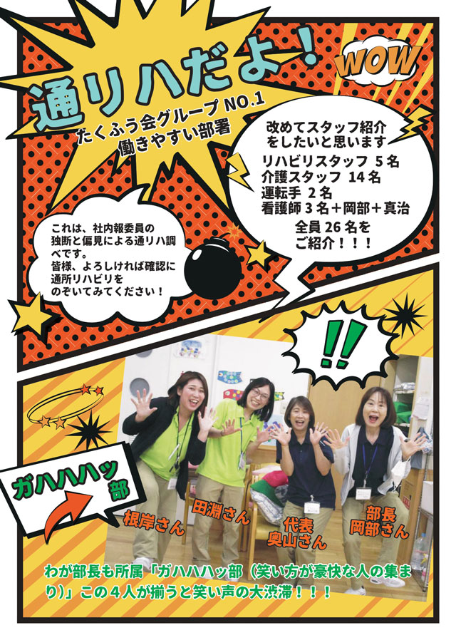2023年度の社内報は、夏(6月)と冬(12月)に発行します。 画像をクリックすると大きな画面で見られます★マークは複数のデータがあります グループ内職員以外の人への開示・ダウンロード保存や印刷は禁止 旭竜クリニック すがわら歯科 総務 通リハ ★ DS八幡 DSあざみ 訪看 訪リハ HS・定期巡回やすらぎ 鍼灸マッサージ ★ GH八幡 GH津島 エルダ―高島 エルダー御野 サ高エルダー ★ たくフーズ 特養いこい ★ 特養えんじゅ 昭友会ケアプラン えんじゅケアプラン 小多機いこい ★ サテライト小多機いこい ★ 津島かがやき 小多機キバラ ★ 晴れバレ ワークおまち ビルド GH祇園 ウェルサークル